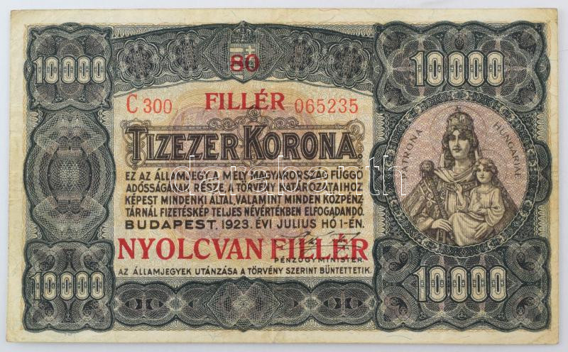 Leírás: 1923. 10.000K "80 FILLÉR - NYOLCVAN FILLÉR" felülbélyegzéssel, nyomdahely jelölés nélkül, piros sorozat- és sorszámmal "C 300 065235" T:F