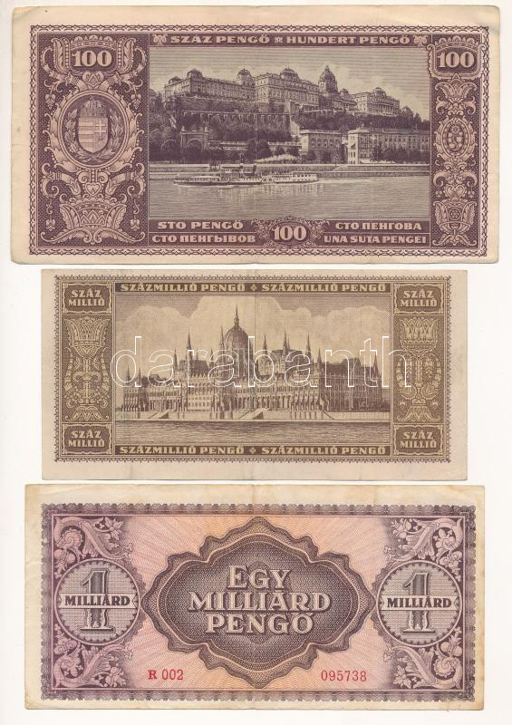 Leírás: 1945. 100P + 1946. 100.000.000P + 1.000.000.000P mindegyik látványosan eltolódott nyomat T:F, közte szép papír