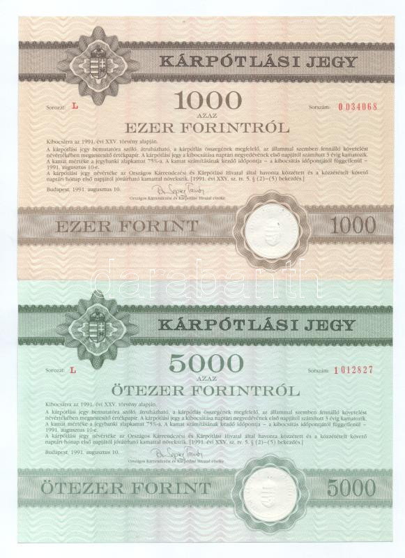 Leírás: Budapest 1991. "Országos Kárrendezési és Kárpótlási Hivatal" kárpótlási jegye 1000Ft + 5000Ft + 10.000Ft-ról, szárazpecséttel T:AU