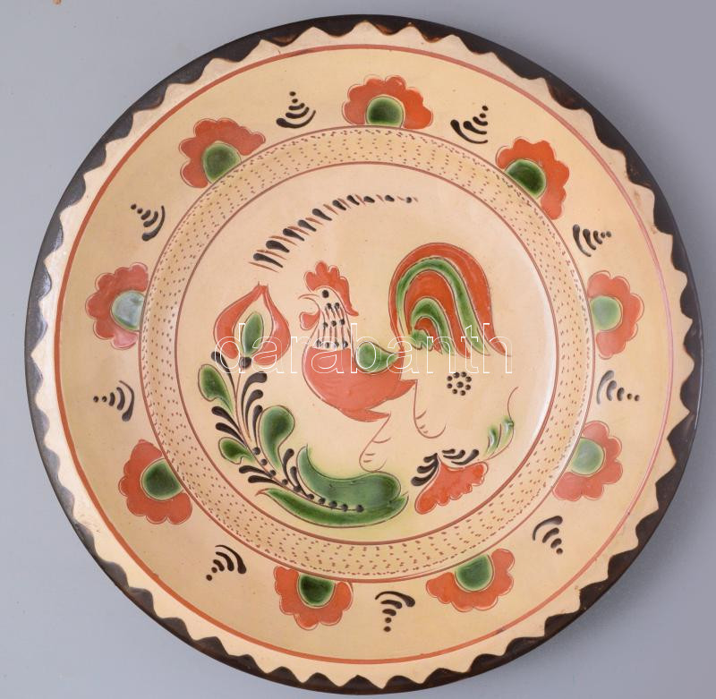 Kakasmintás mázas kerámia falitál, Karcag, kis mázhibával, d: 32 cm https://www.darabanth.com/hu/488-Gyorsarveres/488.0/Porcelan-keramia-uveg/Keramiak~5/Kakasmintas-mazas-keramia-falital-Karcag-kis-mazhibaval-d-32-cm~II3352652