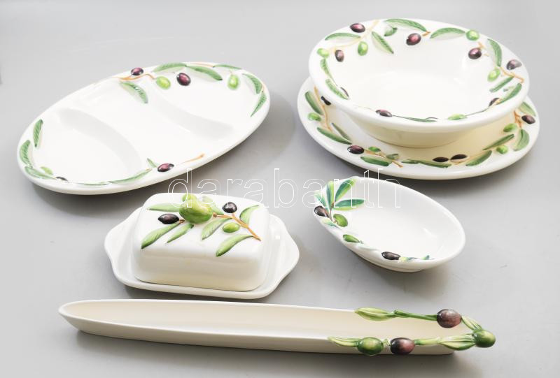 Leírás: Olasz kínáló kerámia készlet plasztikus oliva bogyós díszítéssel. Jelzett, minimális kopással. NEM POSTÁZZUK!