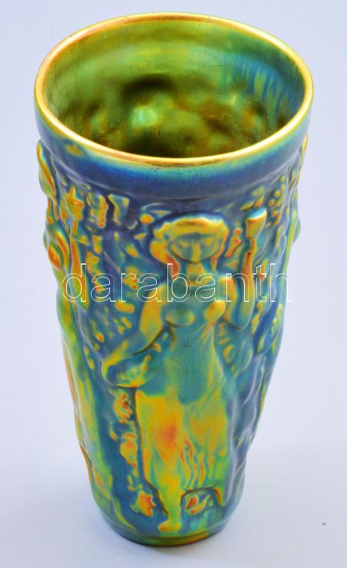 Leírás: Zsolnay eozin mázas szüreti pohár. Zöld és arany eozinmázakkal borított, jelzett, szájánál repedésvonallal, m: 15,5 cm