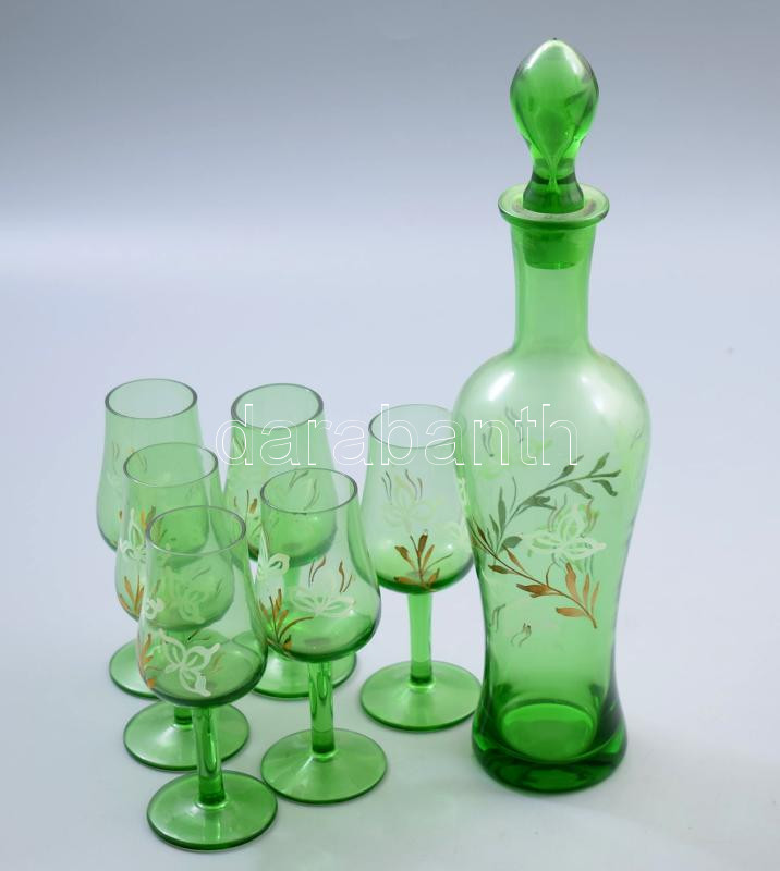 Leírás: cca 1900, Szecessziós italos készlet, anyagában zölden színezett üveg zománcfestett mintával, m: 13-31 cm
