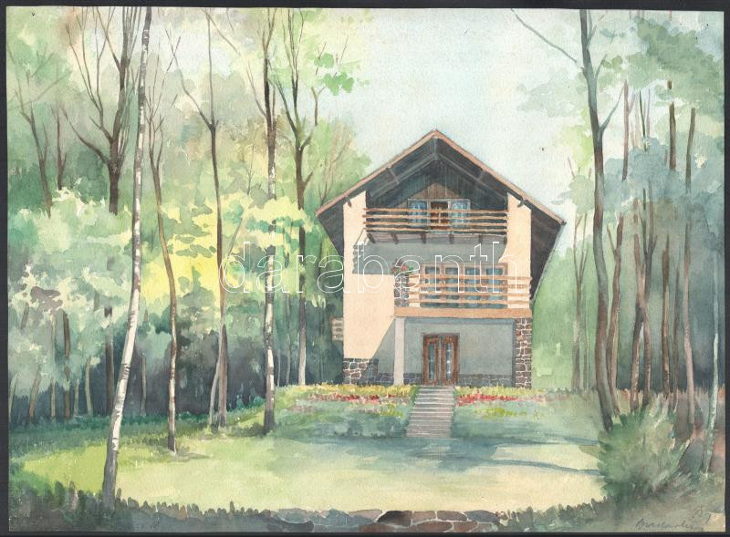 Leírás: Olvashatatlan jelzéssel: Erdei ház. Akvarell, papír, 29x39,5 cm