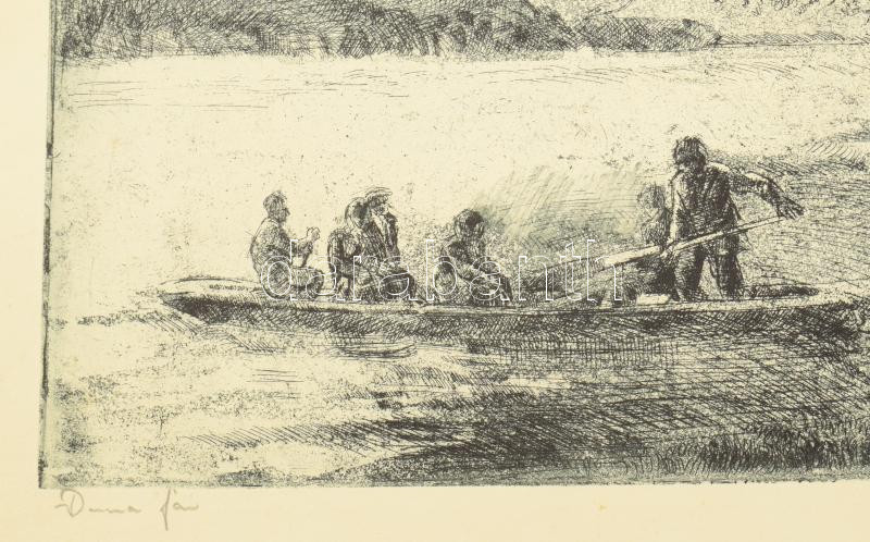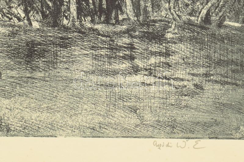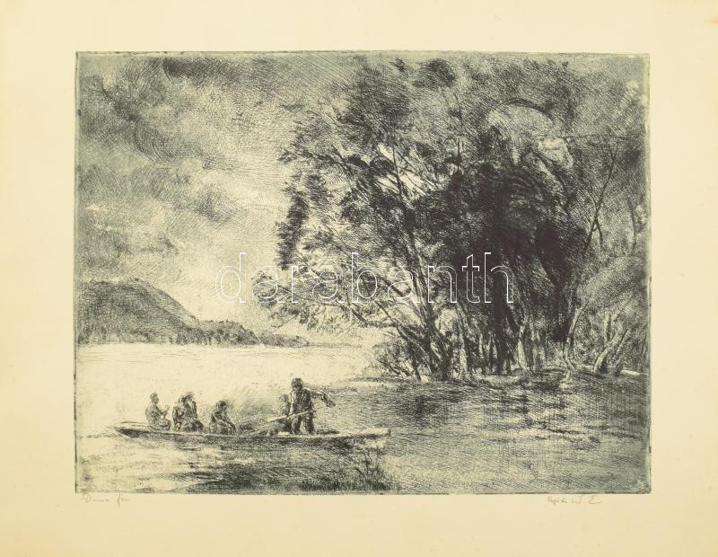 Leírás: Aszódi Weil Erzsébet (1901-1976): Duna fái. Rézkarc, papír, jelzett, kartonra kasírozva, 29×40 cm