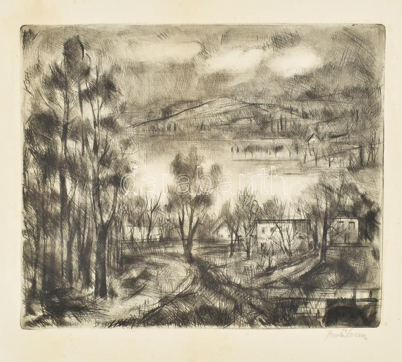 Leírás: Bordás Ferenc (1911-1982): Táj. Rézkarc, papír, jelzett. Lap széle foltos. 24,5x29 cm