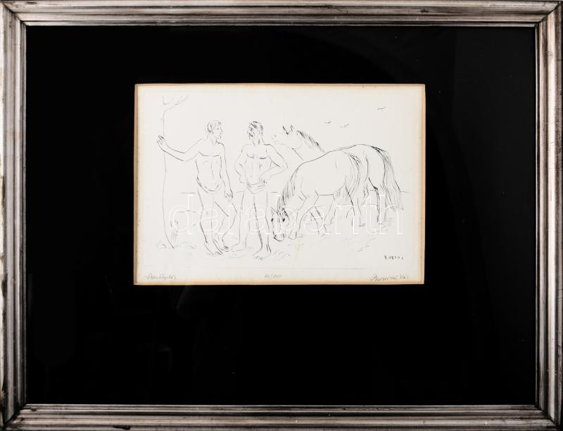 Leírás: Borsos Miklós (1906-1990): Beszélgetés. Rézkarc, papír, jelzett, számozott (76/100), üvegezett fakeretben, lapszélei apró foltokkal, 19×30 cm