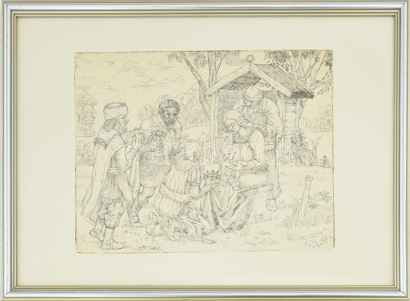 Leírás: Herczeg István (1949- ): Háromkirályok. Rézkarc, papír, jelzett a metszeten. Üvegezett fakeretben. 19,5×26 cm