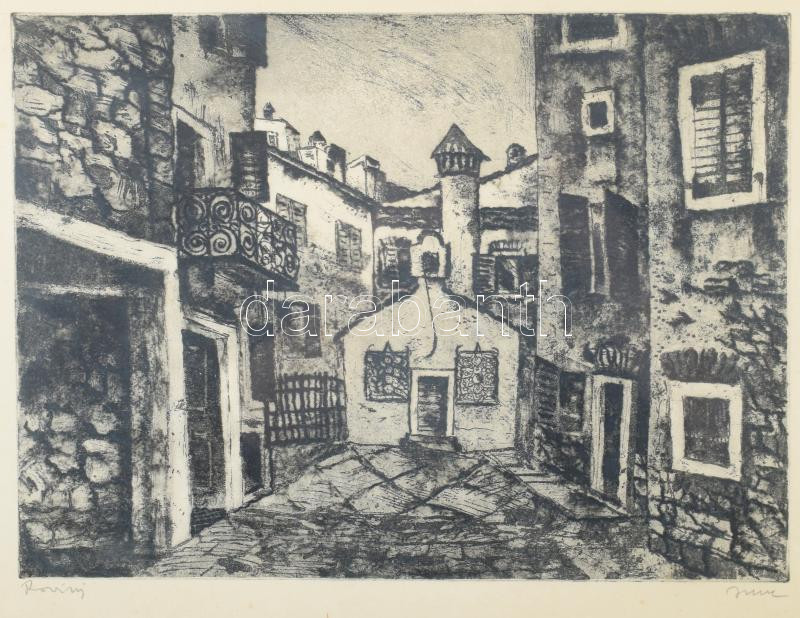 Imre István (1918-1983): Rovinj. Rézkarc, papír, jelzett, üvegezett keretben, 29×39 cm / István Imre: Rovinj (Rovigno). Etching, paper, framed, 29×39 cm