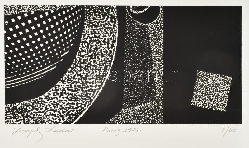 Joseph Kádár (1936-2019): Dualista kompozíció, 1987. Cinkkarc, papír, jelzett, számozott (7/50). Hátoldalon a művész pecsétjével és autográf feliratával. 13,5x27 cm
