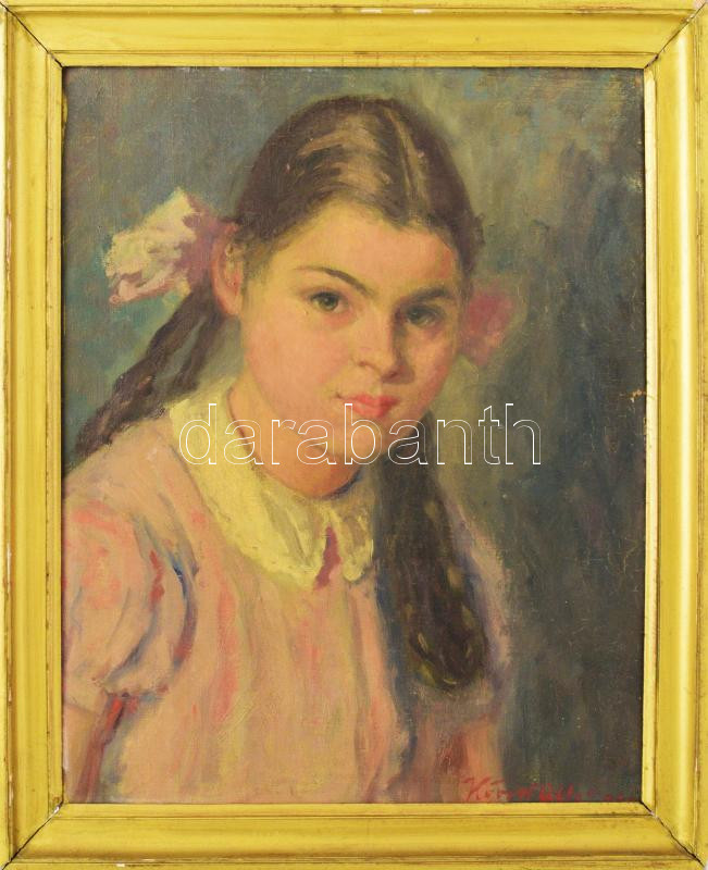 Leírás: Kövesi (Kövesy) Albi (1900-?): Kislány portréja, 1952. Olaj, vászon, jelezve jobbra lent. Apró felületi sérülésekkel. Hátoldalán 1990 előtti MNG kiviteli bélyegzővel. Dekoratív, kissé sérült fakeretben. 48×38 cm