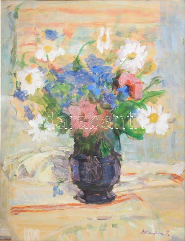 Leírás: Méder Ilona (1903-1988), kolozsvári festőnő: Csendélet. Akvarell, papír, jelzett. Üvegezett fakeretben, 57x44 cm.