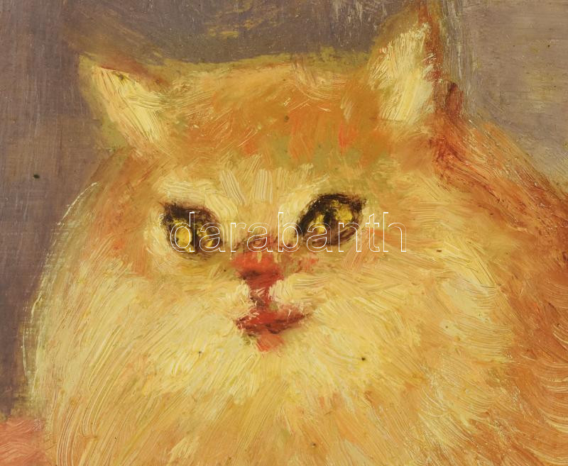 Réti Mátyás (1922-2002): Vörös perzsa macska (cica). Olaj, farost, jelezve jobbra lent, a hátoldalán autográf felirattal. Dekoratív, sérült fakeretben, 15×20 cm
