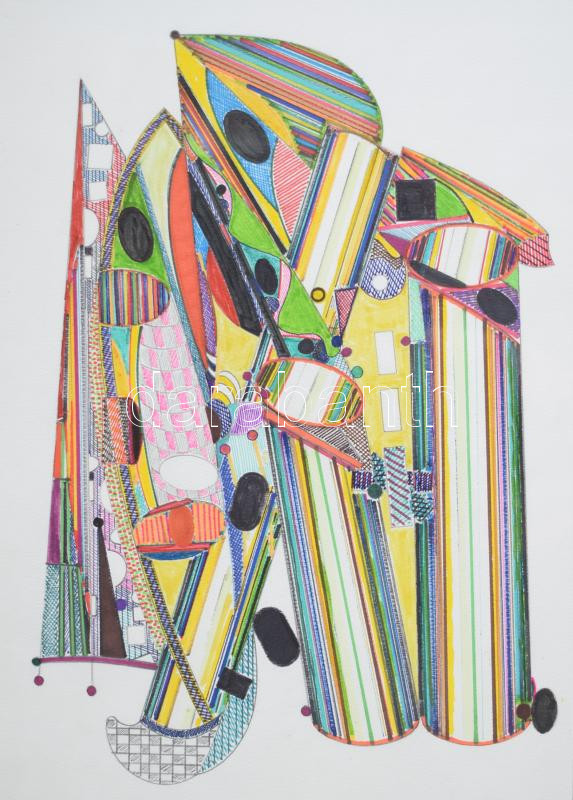 Leírás: Tommy Vig (1938-): Gépesített tűzmadár. Vegyes technika, papír, jelzett a hátoldalán. Üvegezett fakeretben. 38x28 cm