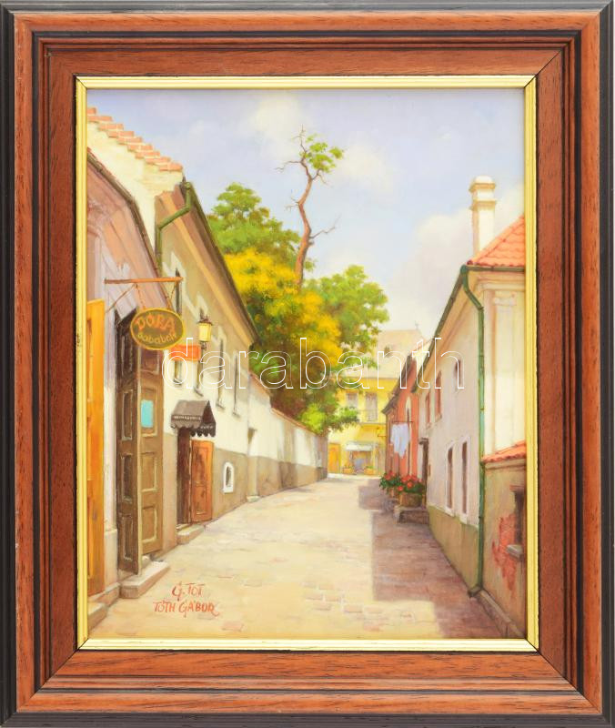 Tóth Gábor (-): Kisvárosi utca. Olaj, fémlemez. Dekoratív fakeretben. ... https://www.darabanth.com/hu/489-Gyorsarveres/489.0/Festmenyek-es-grafikak/Festmenyek-es-grafikak~500001/Toth-Gabor-Kisvarosi-utca-Olaj-femlemez-Dekorativ-fakeretben-25-5x20-5-cm~II3217427