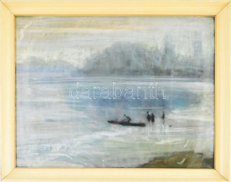 Leírás: Vörös Rozália (1919-1992): Befagyott csónak. Pasztell, papír. Képcsarnokos címkével. Üvegezett keretben 48x65 cm