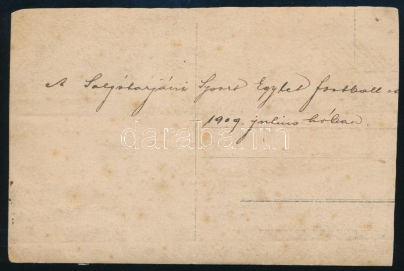 1909 "A Salgótarjáni Sportegylet football csapata", labdarúgócsapatról készült csoportkép, korai futball relikvia, körbevágott fotólap, hátoldalán korabeli felirattal, 8x12 cm