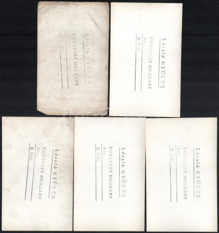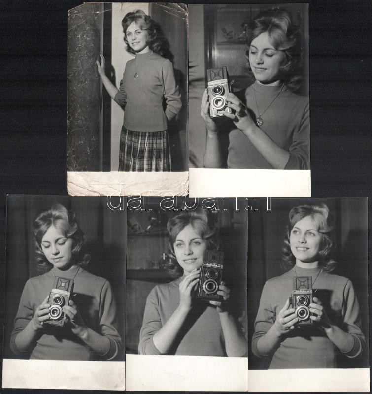 Leírás: Gyökér László (1940-1984): Fotósorozat, hölgy Ljubityel 2 fényképezőgéppel, 5 db fotó, jelzettek a hátoldalon, egy sérült, 14x8,5 cm