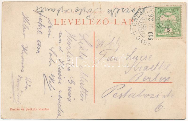 Leírás: 1910 Gyergyószentmiklós, Gheorgheni; gimnázium és járásbíróság. Burján és Székely kiadása / grammar school, district court (ázott sarok / wet corner)