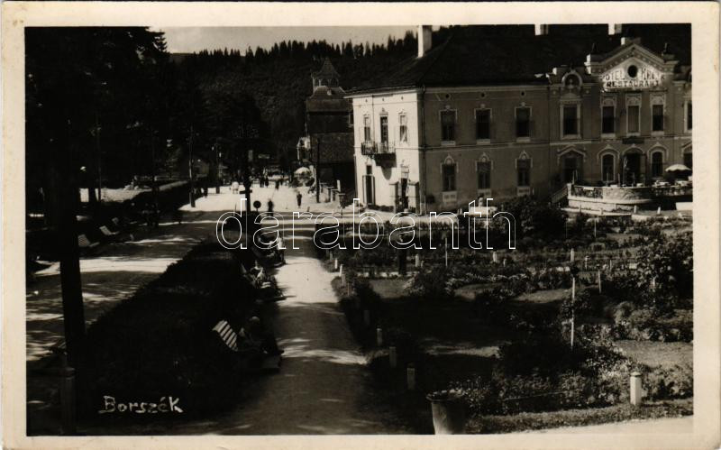 1943 Borszék, Borsec; Park, Hotel Mélik szálloda és étterem. Heiter György udvari fényképész felvétele és kiadása / spa park, hotel and restaurant (ragasztónyom / glue marks)