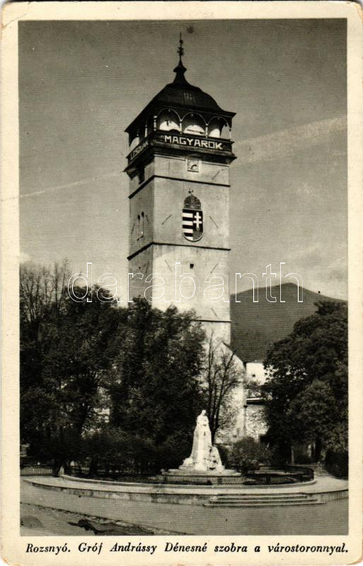 1939 Rozsnyó, Roznava; Rákóczi őrtorony magyar címerrel és "Magyarok leszünk" irredenta felirattal, Gróf Andrássy Dénesné (Franciska) szobor / watchtower with Hungarian coat of arms and irredenta propaganda, statue (kopott sarkak / worn corners)