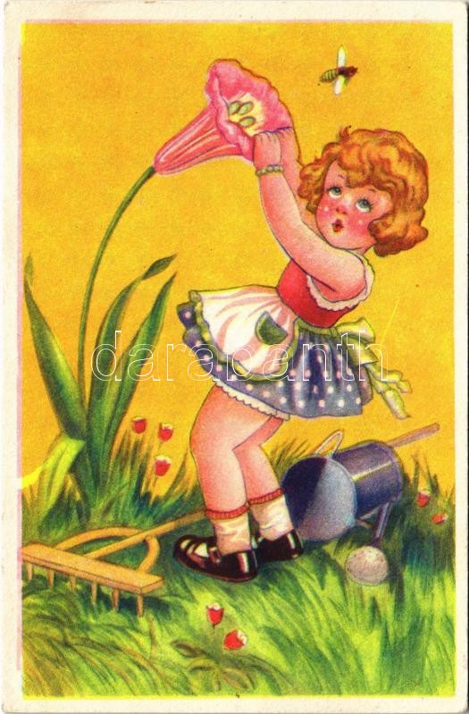 Children art postcard, girl with flower and bee (EK) https://www.darabanth.com/hu/489-Gyorsarveres/489.0/Kepeslapok/Gyerek~1500024/Children-art-postcard-girl-with-flower-and-bee-EK~II2684027