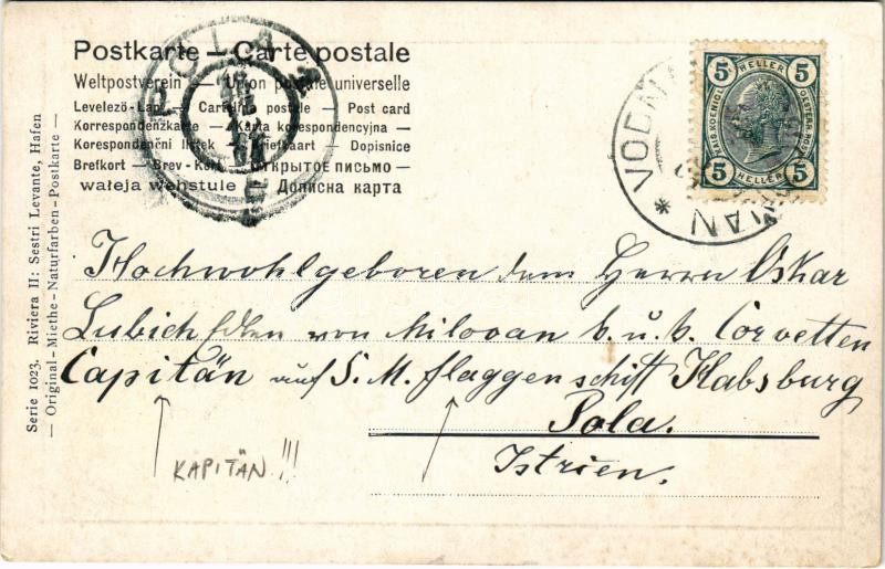 Leírás: 1904 Addressed to K.u.k. Kriegsmarine Korvettenkapitän Oskar Lubich von Milovan at S.M.S. Habsburg
