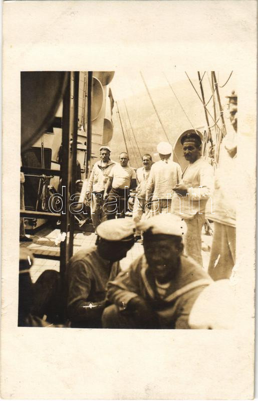 SMS Aspern az Osztrák-Magyar Haditengerészet Zenta-osztályú védett cirkáló matrózai a fedélzeten / K.u.K. Kriegsmarine Matrosen / Austro-Hungarian Navy Zenta-class protected cruiser's mariners on deck. photo
