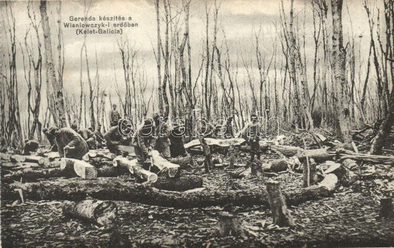Gerenda készítés a Wisniowczky-i erdőben, kiadja a M. kir. 10. honvéd gyalogezred / Beam cutting in the Wisniowczky Forest, K.u.K. Army, WWI, published by the 10th Royal Hungarian Infrantry regiment; from postcard booklet