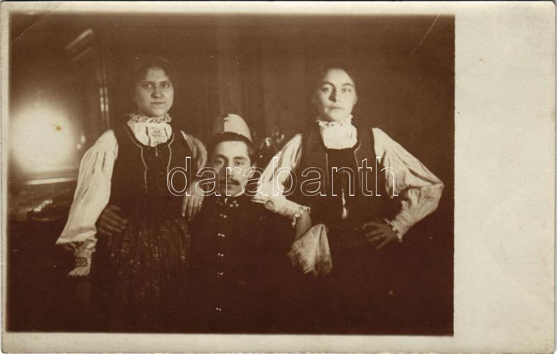 Leírás: Magyar katona népviseletbe öltözött nőkkel / Hungarian military and folklore, soldier. photo (EK)
