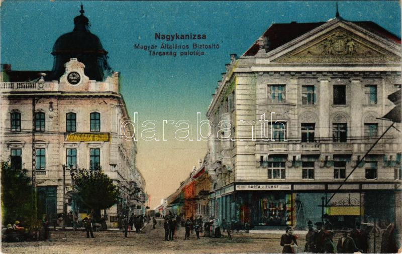 Leírás: Nagykanizsa, Magyar Általános Biztosítótársaság palotája, Hungária biztosító, piac, Barta és Fürst üzlete (fl)