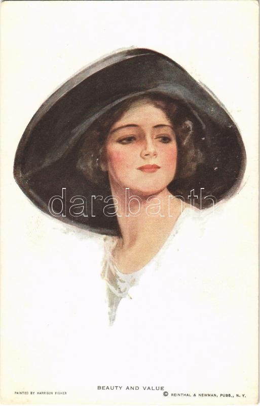 Leírás: "Beauty and Value" Lady art postcard. Reinthal & Newman No. 262. s: Harrison Fisher