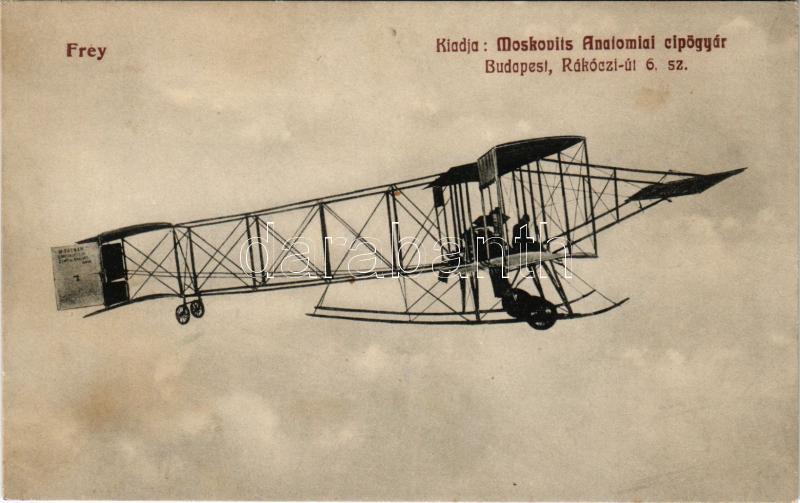 Frey repülőgép. Kiadja Moskovits Anatómiai cipőgyár / aircraft https://www.darabanth.com/hu/489-Gyorsarveres/489.0/Kepeslapok/Reklam~1500045/Frey-repulogep-Kiadja-Moskovits-Anatomiai-cipogyar-aircraft-3Cbr-3E~II3265616