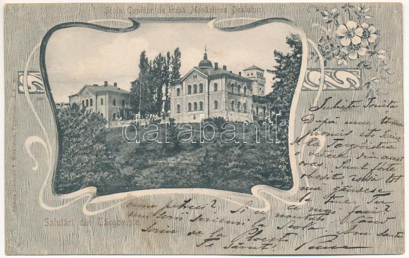 Leírás: Targoviste, Tergovistye, Tirgovics; Scola Copiilor de trupa Monastirea Dealului / monastery. Art Nouveau, floral (Rb)