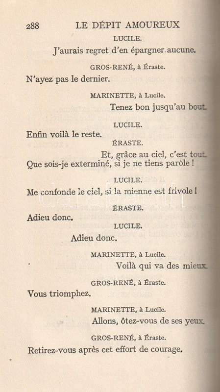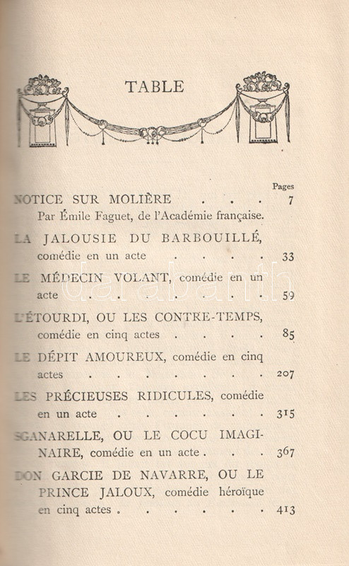 Moliere [Poquelin, Jean-Baptiste]: Oeuvres completes en six volumes. Tome I-VI. [Teljes mű hat kötetben.] Paris, [1905 körül]. Éditeurs Nelson 1 t. (címkép) + 501 + [11] p. + 5 t.; 528 + [16] p. + 7 t.; 474 + [6] p. + 5 t.; 497 + [15] p. + 5 t.; 444 + [4] p. + 4 t.; 475 + [5] p. + 4 t. A Charles Saroléa (1870-1953) belga filológus által sajtó alá rendezett, illusztrált Moliere-összkiadás életrajzi jegyzetét Émile Fauget (1847-1916) francia irodalomtörténész írta. Valamennyi vígjáték, balett, pásztorjáték és tragédia előtt rövid irodalomtörténeti bevezetés, a táblákon a vígjátékok, pásztorjátékok, mitológiai darabok kulcsjeleneteinek részletgazdag rajza. Egységes, aranyozott, álbordázott gerincű korabeli félmaroquin kötésben. Dekoratív, szép példány.