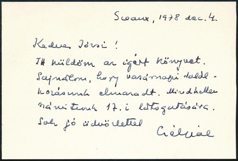 Szélpál Árpád: Versek. Párizs, 1977, Magyar Műhely, 93+3 p. Első kiadás. Emigráns kiadás. Kiadói papírkötés, a gerincen kis sérüléssel, de alapvetően jó állapotban. A könyvhöz tartozó kártyán a szerző, Szélpál Árpád saját kezű dedikációjával ("Kedves Józsi! Itt küldöm az ígért könyvet. ..."), dátumozva (Sceaux, 1978. dec. 4.) Szélpál Árpád (1897-1987) költő, újságíró, fotóművész, avantgárd mozgalmak tagja (Galilei kör, Kassák csoportja), első versei a MA folyóiratban jelentek meg.