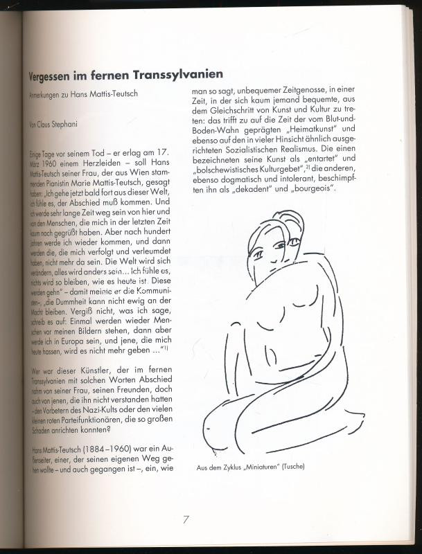 Claus Stephani: Hans Mattis-Teutsch 1884-1960. Grafiken, Schriften, Zeitdokumente. München, 1993, Haus des Deutschen Ostens. 41p. Német nyelven. Fekete-fehér képekkel, Mattis-Teutsch János (1884-1960) műveinek reprodukcióival gazdagon illusztrált. Kiadói papírkötés, borítón apró kopásnyomokkal.