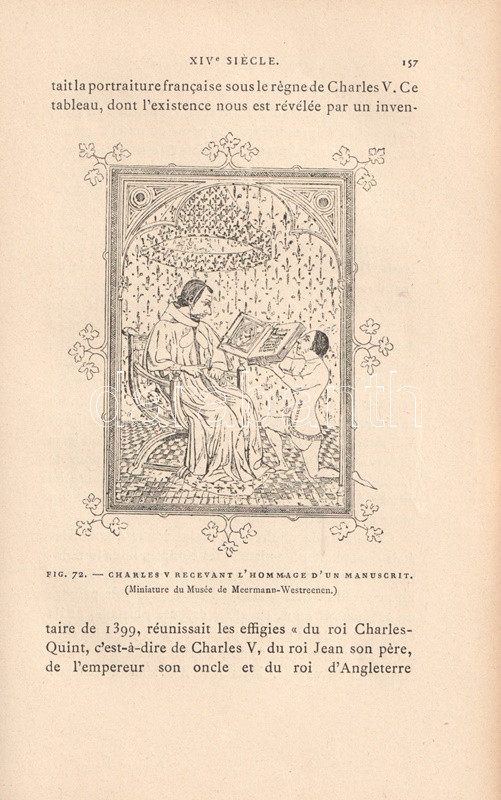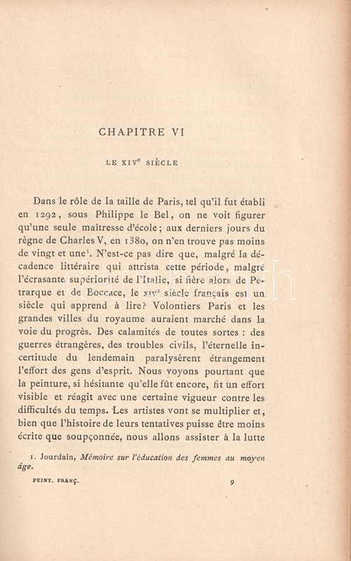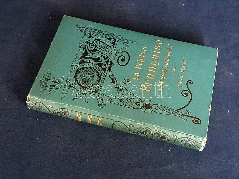 Mantz, Paul: La peinture francaise du IXe siecle a la fin du XVIe. Avec une introduction par Olivier Merson. [Párizs] Paris, (1897). Société Francaise d'Éditions d'Art (Imprimerie Motteroz). 288 p. Első kiadás. Paul Mantz (1821-1895) Becsület-renddel kitüntetett francia műkritikus, szerkesztő, rendezvényszervező. A műkritika és a szépészeti bírálat legmagasabb státuszaiban foglalkoztatott szerző a franciaság esszenciájának kutatásának jegyében egyre inkább a középkor franciaországi művészete felé fordult. Oldalszámozáson belül szövegközti és egész oldalas illusztrációs anyaggal gazdagon díszített szakmunka. (Bibliotheque de l'Enseignement des Beaux-Arts.) Festett, aranyozott kiadói egészvászon kötésben. Jó példány.