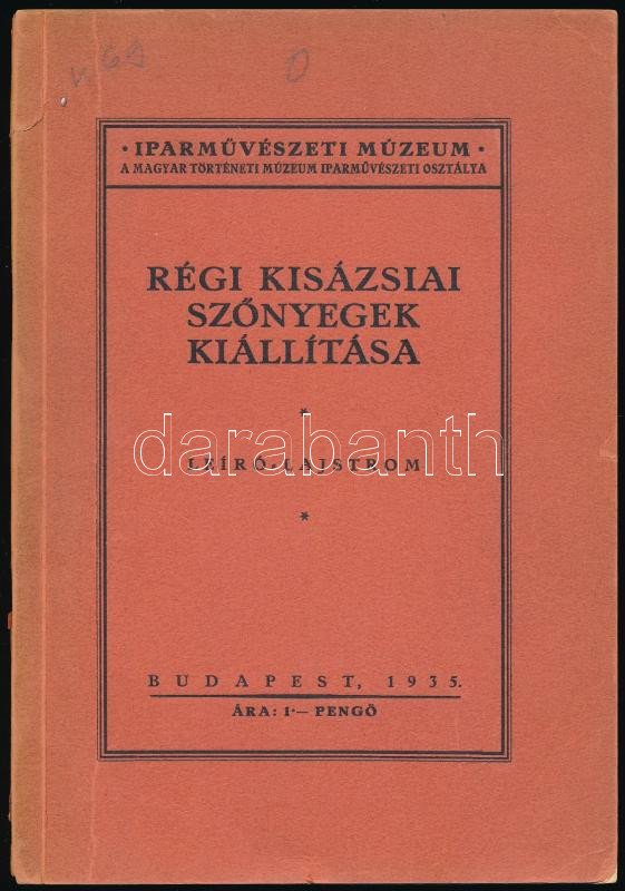 Régi kisázsiai szőnyegek kiállítása (Leíró lajstrom). Szerk.: Dr. Layer Károly. Iparművészeti Múzeum: Budapest, 1935. Kiadói papírkötésben. Jó állapotú, a gerince kissé szakadt.