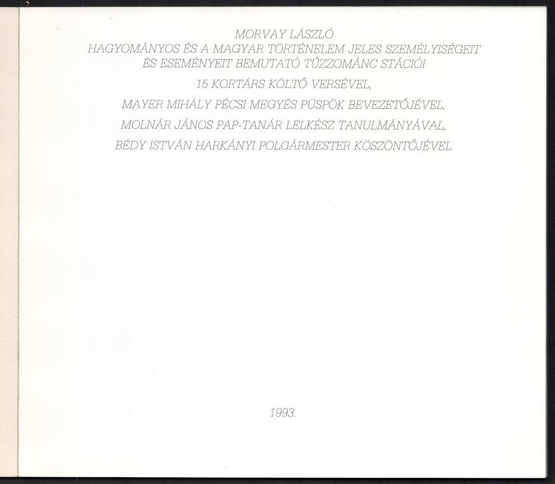 Stációk. Morvay László tűzzománcai. Kortárs magyar költők versei. Mayer Mihály pécsi megyés püspök bevezetőjével. Molnár János pap-tanár lelkész tanulmányaival. Bédy István harkányi polgármester köszöntőjével. Harkány, 1993., Harkányi Római Katolikus Egyházközség. Kiadói papírkötés
