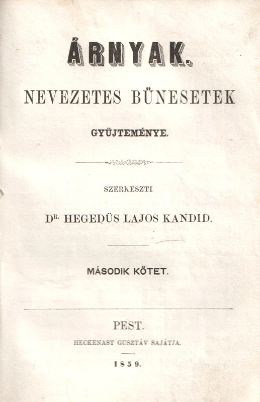 Árnyak. Nevezetes bűnesetek gyűjteménye. Szerkeszti Hegedüs Lajos Kandid. Első-második kötet. [Teljes, egybekötve.]