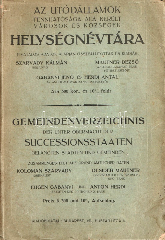 Az utódállamok fennhatósága alá került városok és községek helységnévtára. Hivatalos adatok alapján összeállították és kiadják: Szarvady Kálmán, Mautner Dezső, Gabányi Jenő és Herdi Antal.