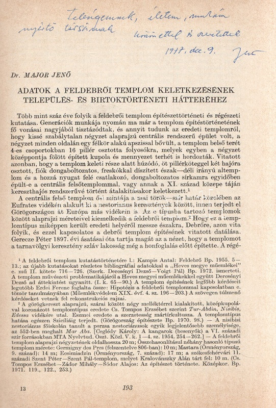Dedikált: "Feleségemnek, életem, munkám segítő társának köszönettel és szeretettel: Jenő. 1977. dec. 9." Major Jenő (1922-1988) településtörténész rövid tanulmányában a Heves megyei Feldebrőn található, Árpád-kori templom alapításának egy közkeletű tévedését cáfolja. Okiratokból, birtoklevelekből jut a szerző arra a következtetésre, hogy a fundálás nem köthető az 1041-1044 között uralkodott Aba Sámuel királyunk személyéhez, a legenda feltehetően onnan származik, hogy a templom kegyurai később az Aba nemzetségből kerültek ki.