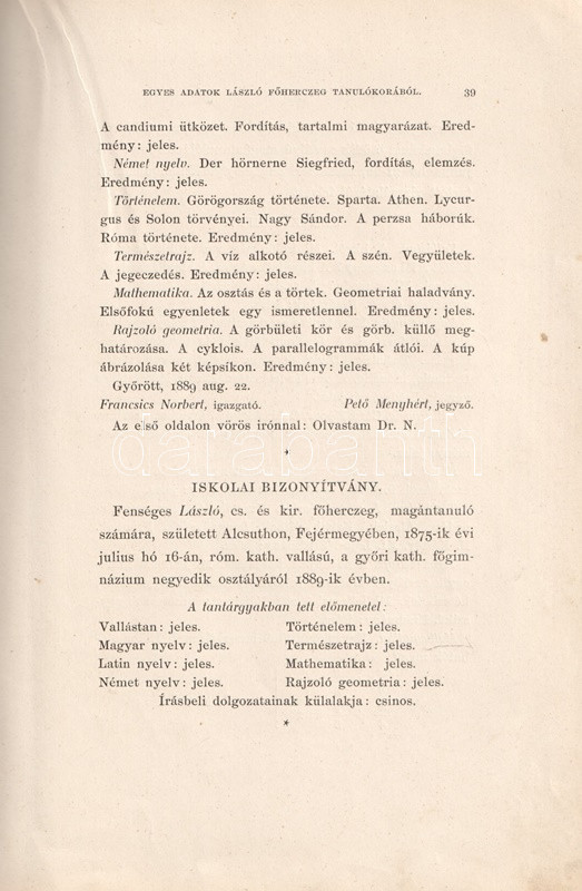 Ponori Thewrewk István (1863-1931) újságíró kegyeletes hangú megemlékezése Habsburg-Lotaringiai László főhercegről (1875-1895), a Habsburgok nádori ágából származó, katonának tanult, vadászbalesetben elhunyt méltóságáról. Oldalszámozáson belül egész oldalas fotókkal gazdagon illusztrált életrajzi méltatás, a Habsburg-sarj magyar tárgyú írásbeli dolgozatainak hasonmásával, illetve katonai és vadász ifjúságának gazdag fotóanyagával. A tartalomból: József főherczegnél Alcsuthon Részletek László főherczeg vadászataiból Adatok László főherczeg katonaéveiről A címlapon, az első előzéken és a belív néhány oldalán enyhe foltosság.