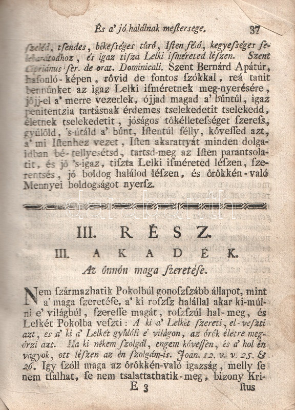Ozolyi Flórián (1683-1755) ferences szerzetes, nagyszombati hitszónok műve egy latin nyelvű kegyességi munka fordítása. Az ízes magyarsággal készített fordítás számos történeti anekdotát és elrettentő világi példát idézve sarkallja igaz katolikus olvasóját a kegyes életre; a bűnöktől, a világ hívságaitól és a lutheri-kálvini eretnekségtől való tartózkodásra. A fordítás először 1722-ben jelent meg, Pozsonyban, példányunk a ferences munka ötven évvel későbbi egri kiadásából való. A bekötött címlapon és az ajánlást hordozó első levélen nagyobb pótlás, a belív négy levele a gerincnél megerősítve, a belív 36 levelének alsó sarkán, szövegtükrön kívüli szúrágásnyomok, a címlapon markánsabb, számos oldalon halvány foltosság. Az első előzéken régi tulajdonosi bejegyzés, néhány oldalon széljegyzetek.