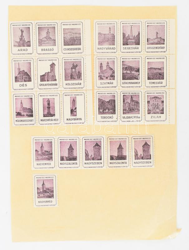 Leírás: Erdélyi városok 21 db 18 különböző irredenta levélzáró papírlapra ragasztva