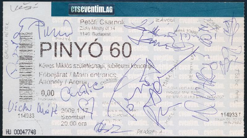 Pinyó 60 [Piramis, Köves Miklós] aláírások: Gallai Péter, Viktor Máté, Závodi János, Somló Tamás, Zsoldos Tamás, Török Péter, Török Ádám, Charlie, Paróczai Attila, Muck Ferenc és Pinyó "Köves Miklós" aláírásokkal.