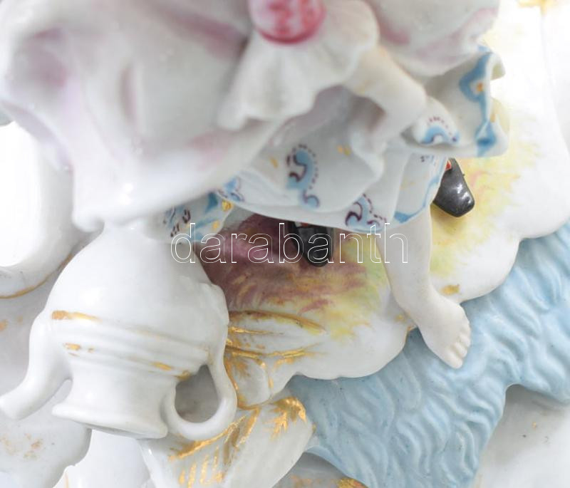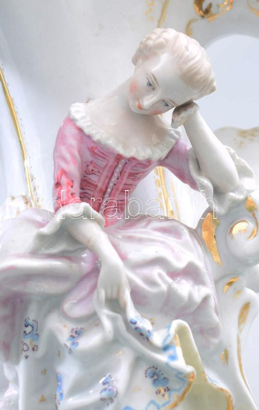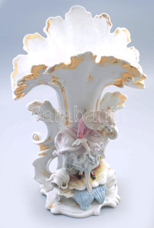 cca 1865-1875 Sutherland & Sons váza, vízbe lépő hölgy alakjával. Jelzett: masszába nyomott S&S, kopással, hölgy ujjai, illetve egy levél vége hiányoznak, m: 37 cm.