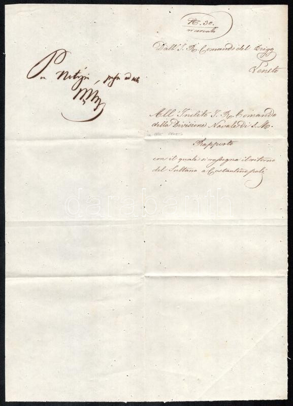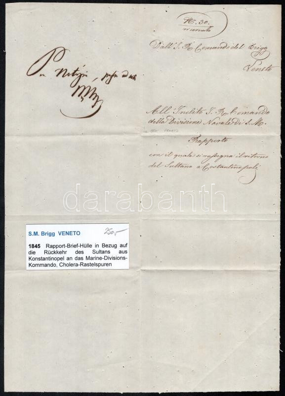 1845 Borító az S. M. Brigg Veneto parancsnokságtól az osztrák haditengerészeti hadosztály parancsnokságnak szóló levélhez, mellékelve a szultán Konstantinápolyba való visszatéréséről szóló jelentést. A szultán akkoriban (1845-46) Abdul Mejid I (ur. 1839-1861) volt. A hátoldalon található jelölések arra utalnak, hogy a levelet kolera ellen fertőtlenítették. / Cover from the Command of the Brig Veneto to the Command of the Austrian Naval Division, enclosing a report on the return of the Sultan to Constantinople. The Sultan at the time (1845-46) was Abdul Mejid I (r. 1839-1861). Markings on the back indicate the letter was disinfected for cholera.