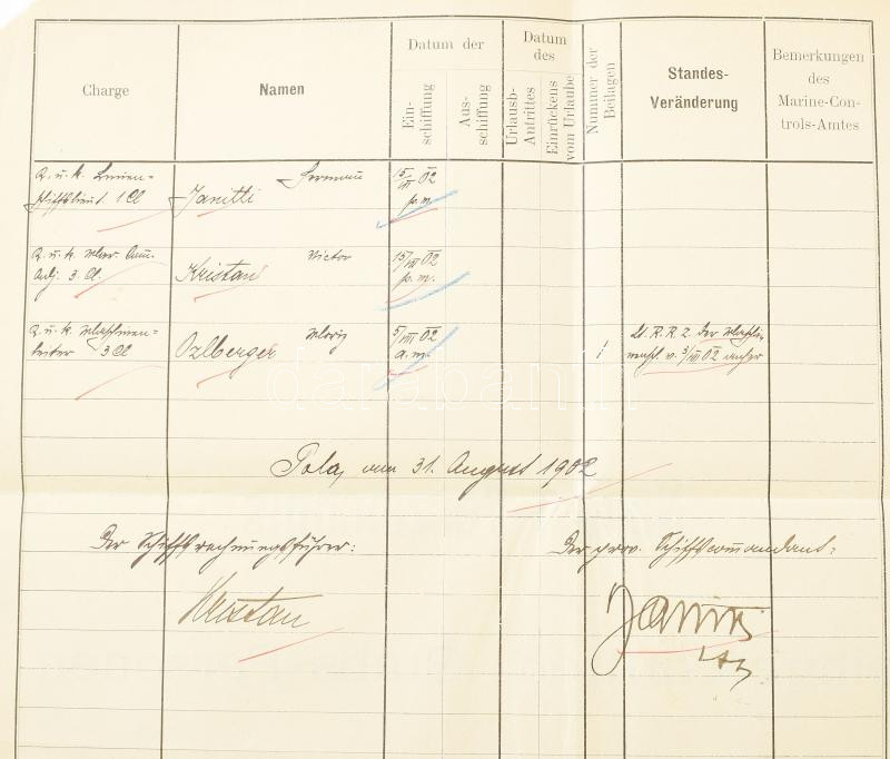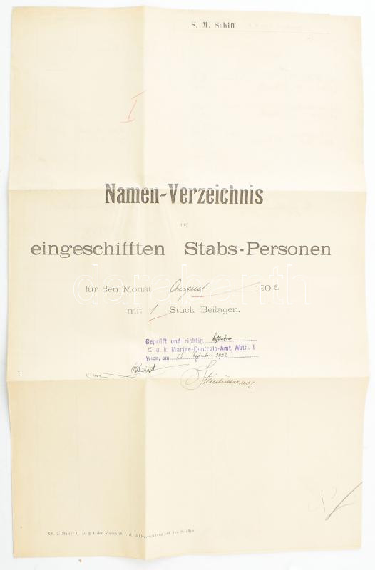 1902 Az S.M.S. Frundsberg kimutatása az 1902 augusztásban fedélzetre lépett személyekről. Hajópecséttel / 1902 S.M.S. FrundsbergNamensverzeichnis der eingeschifften Stabs-Personen [roughly, List or Roster of Names of Staff Officers, not ordinary seamen] who came on board during the month of August 1902. Four-page official document with ship seal